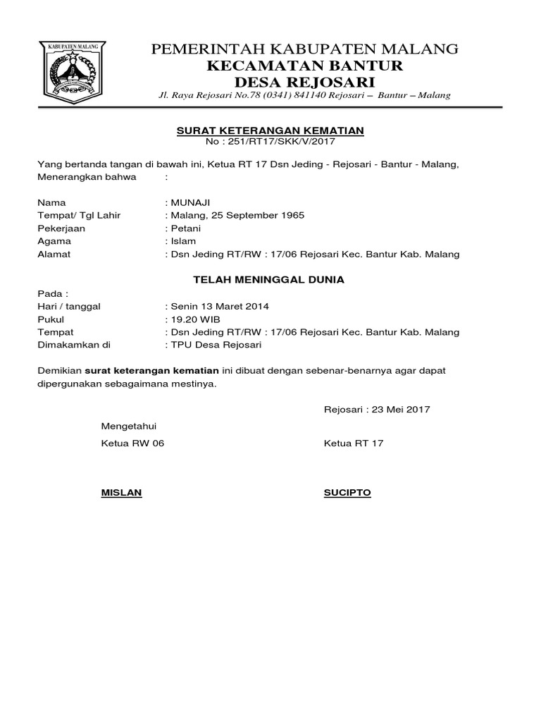 Contoh Surat Keterangan Kematian Dari Desa Pdf : Akte Kematian Dinas Kependudukan Dan Pencatatan Sipil Kabupaten Gresik : Hal ini tidak terlepas dari tingginya angka melek huruf suku lampung.